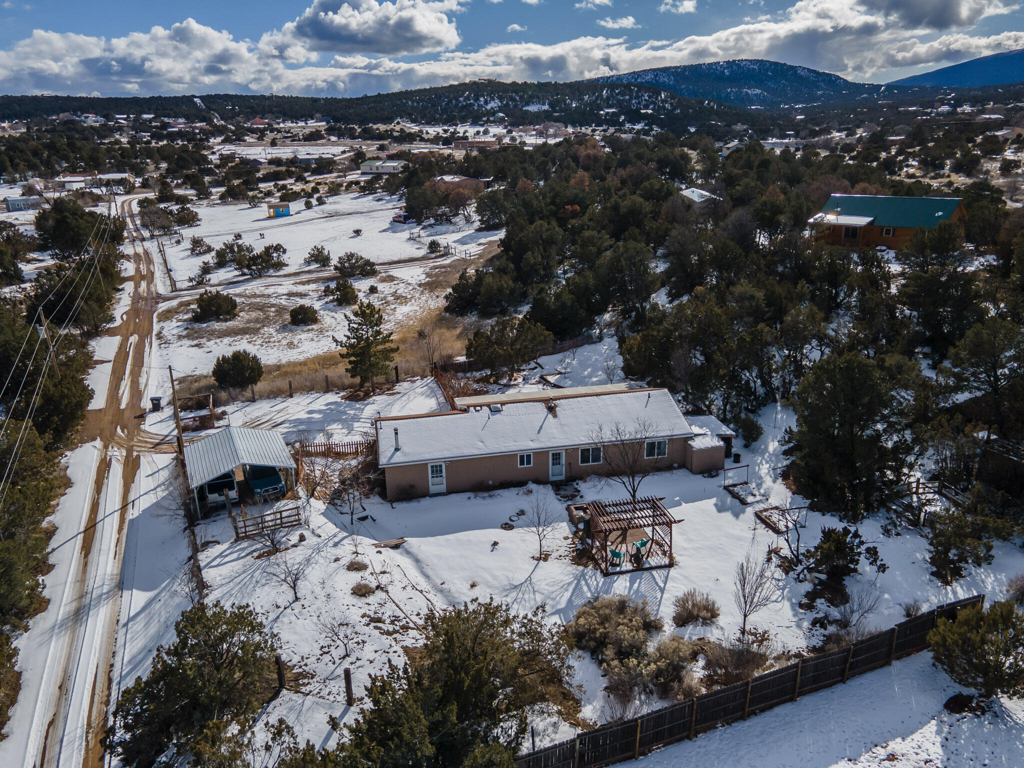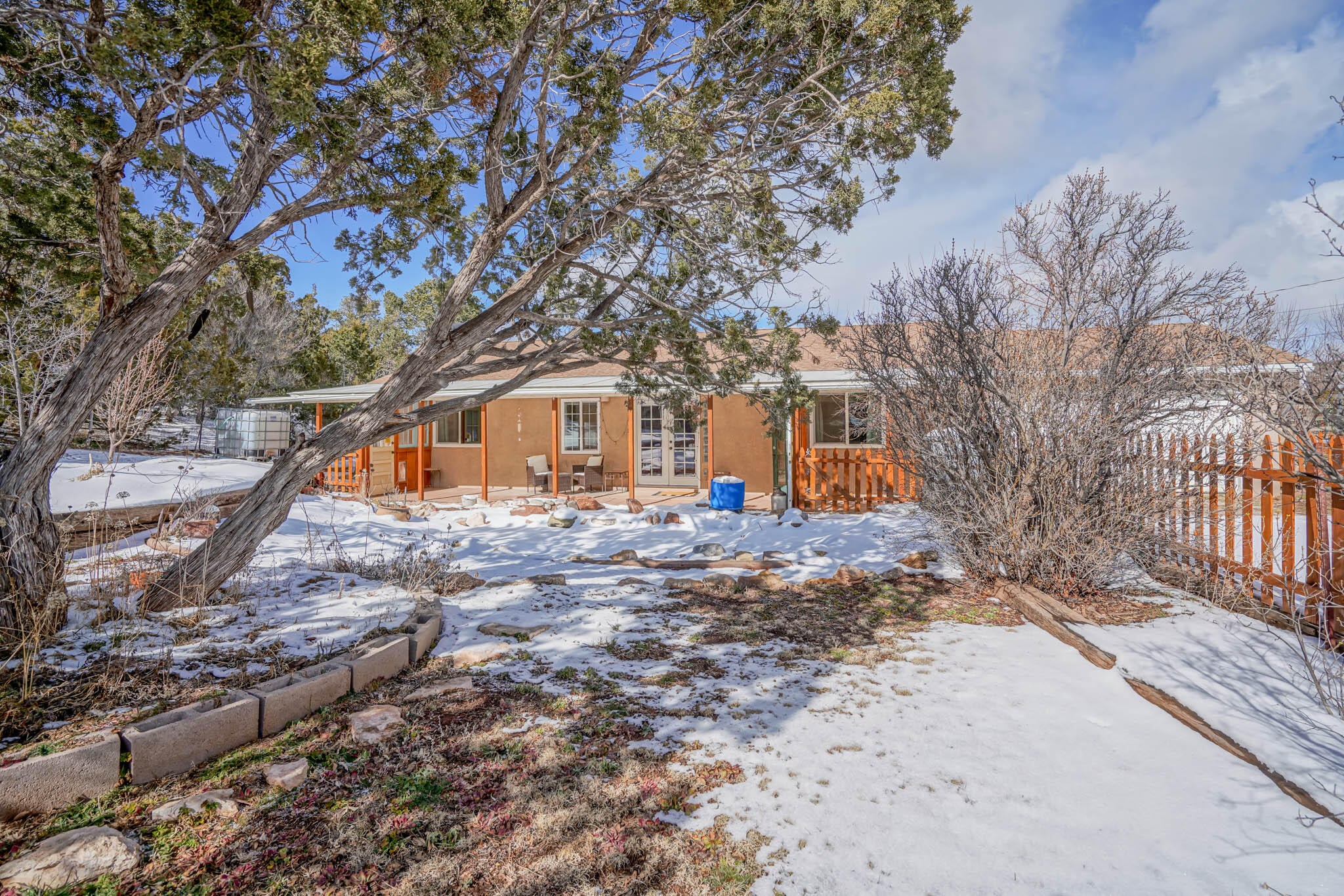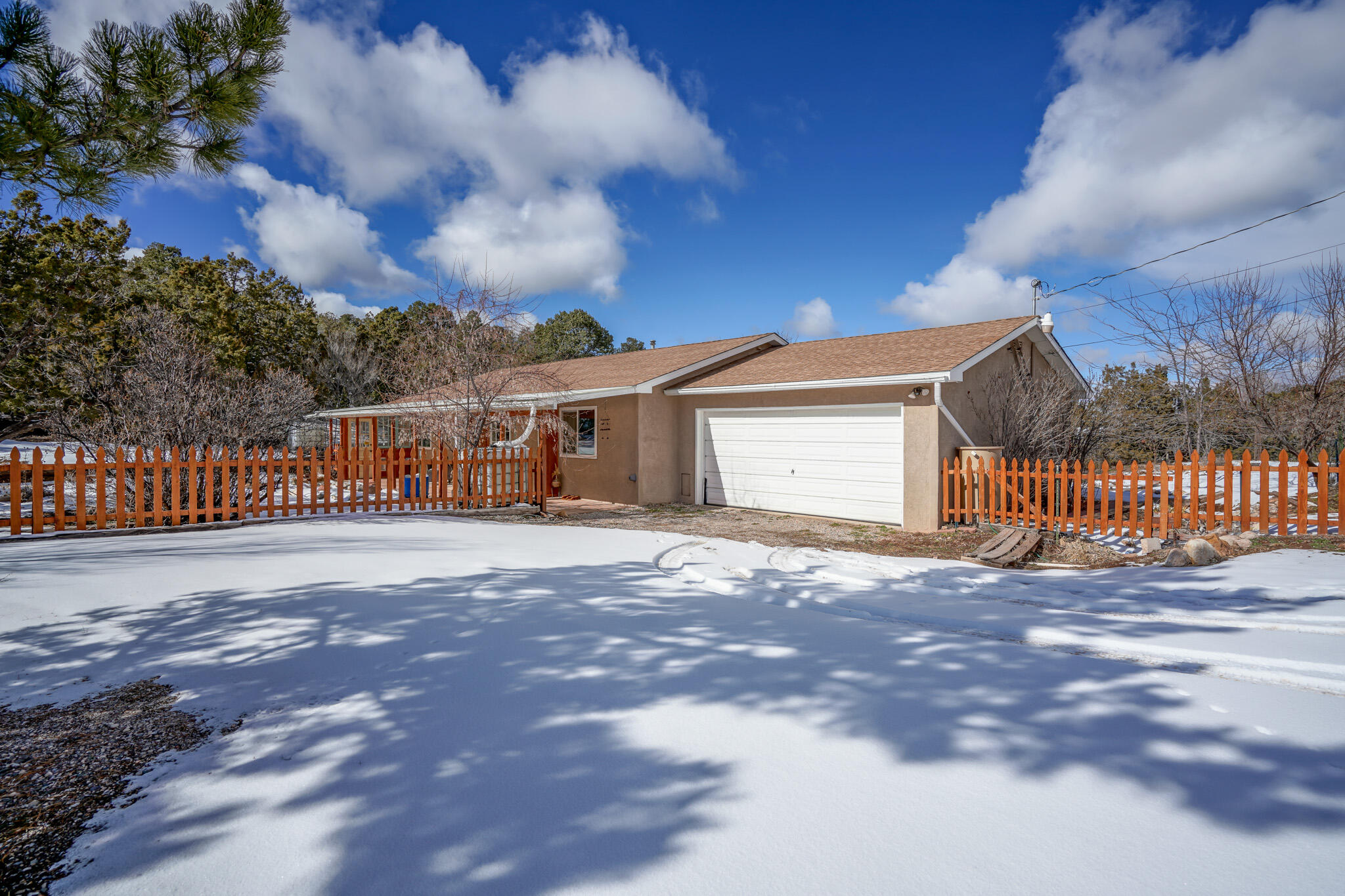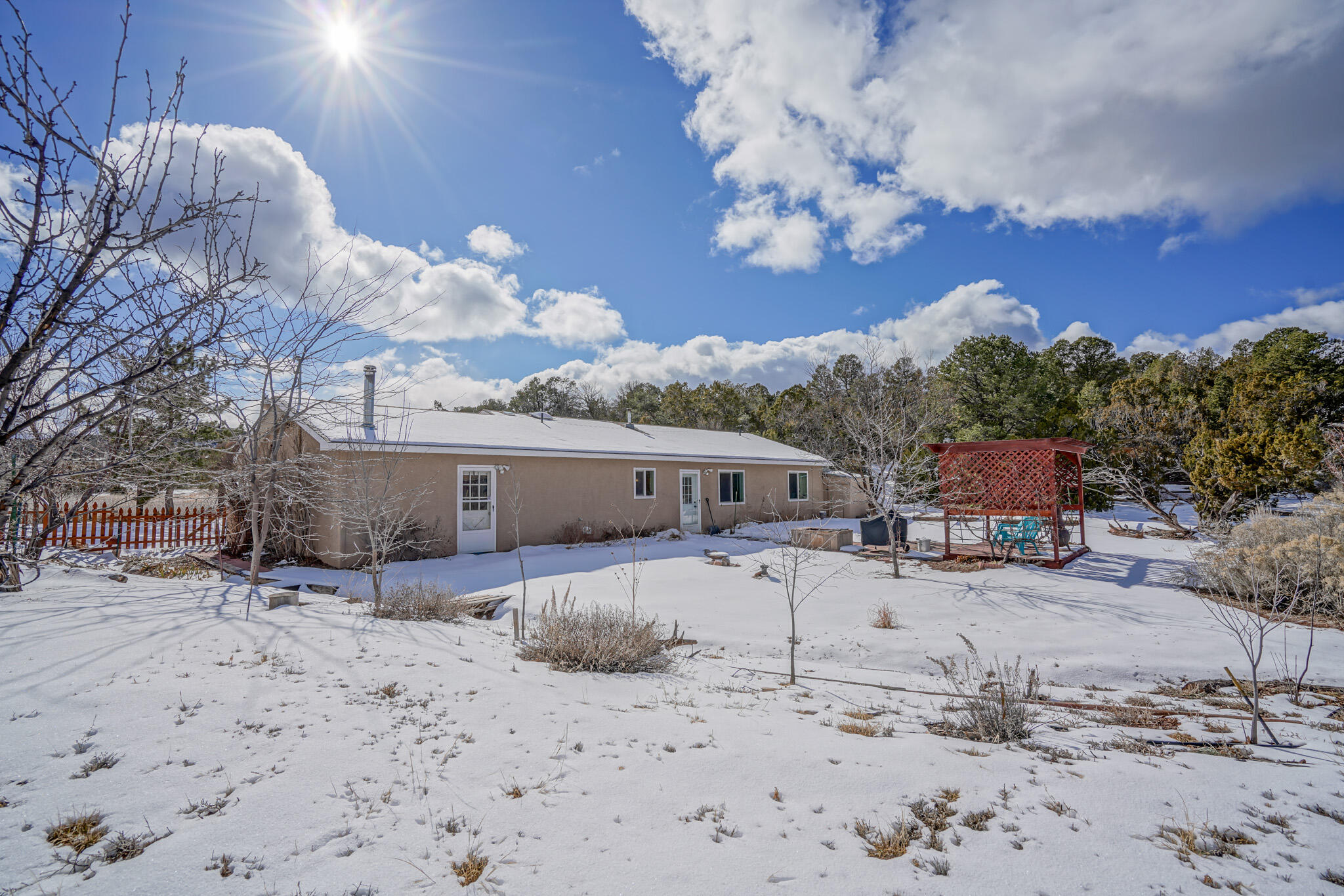 Easy country living in Sandia Park! This well-maintained mountain home is on .75 fenced acre. Cozy pellet stove in main living area, with french doors to let the light pour into the vaulted-ceiling living room. Nicely updated kitchen with hickory cabinets and SS appliances. Nice floor plan with primary bed separate from the secondary beds/bath. Covered porch out front overlooks the fish pond, while block pavers lead to the pergola out back. Enjoy the crisp mountain air while stargazing! Built-in outdoor fire pit, storage/wood sheds, chicken coop and separate carport. Two-car garage has exterior access door and doggie door ready for your pup. All-electric home is on community water system - no well to maintain!