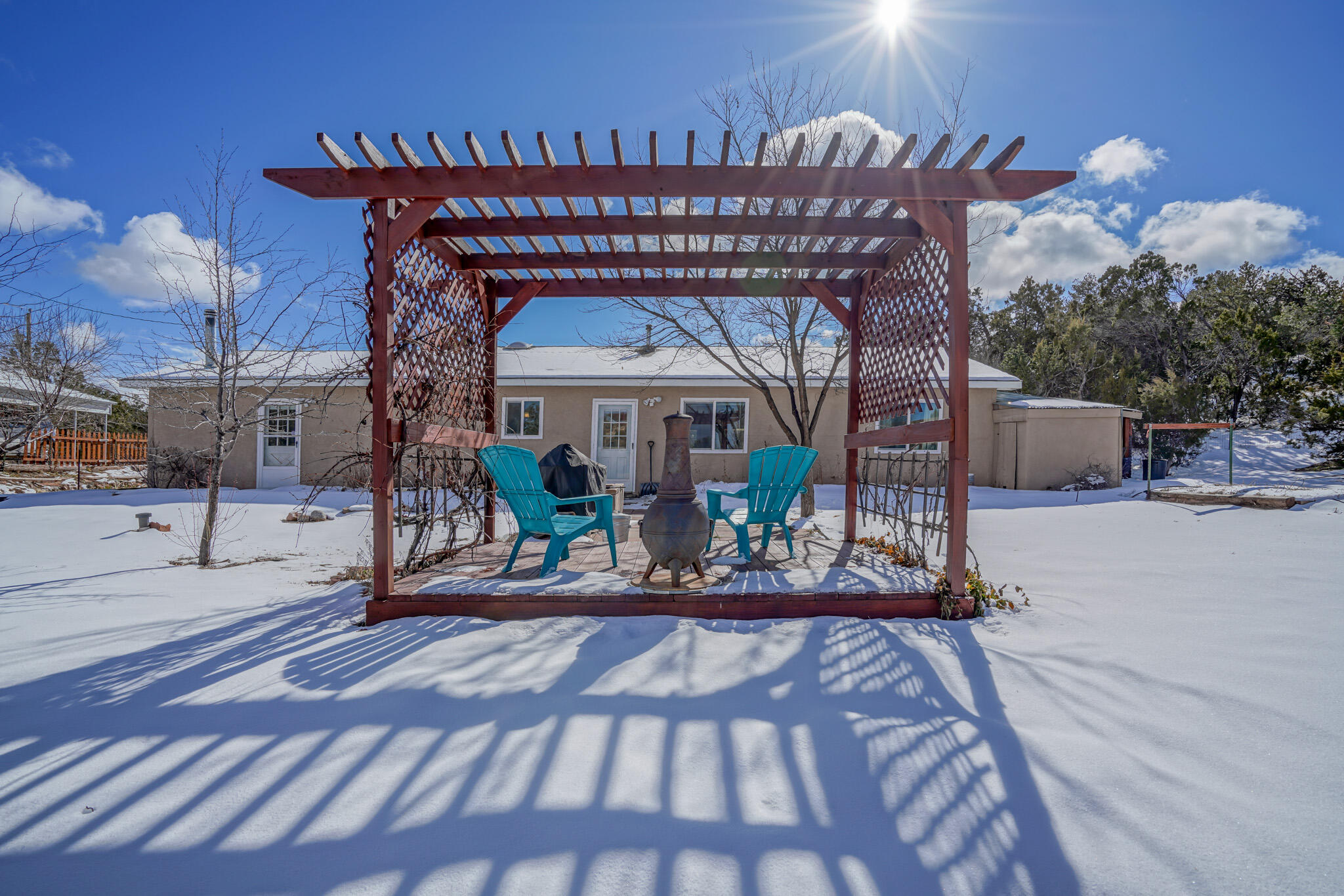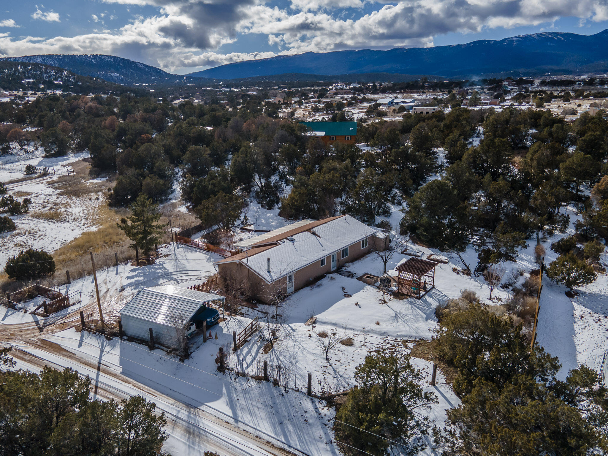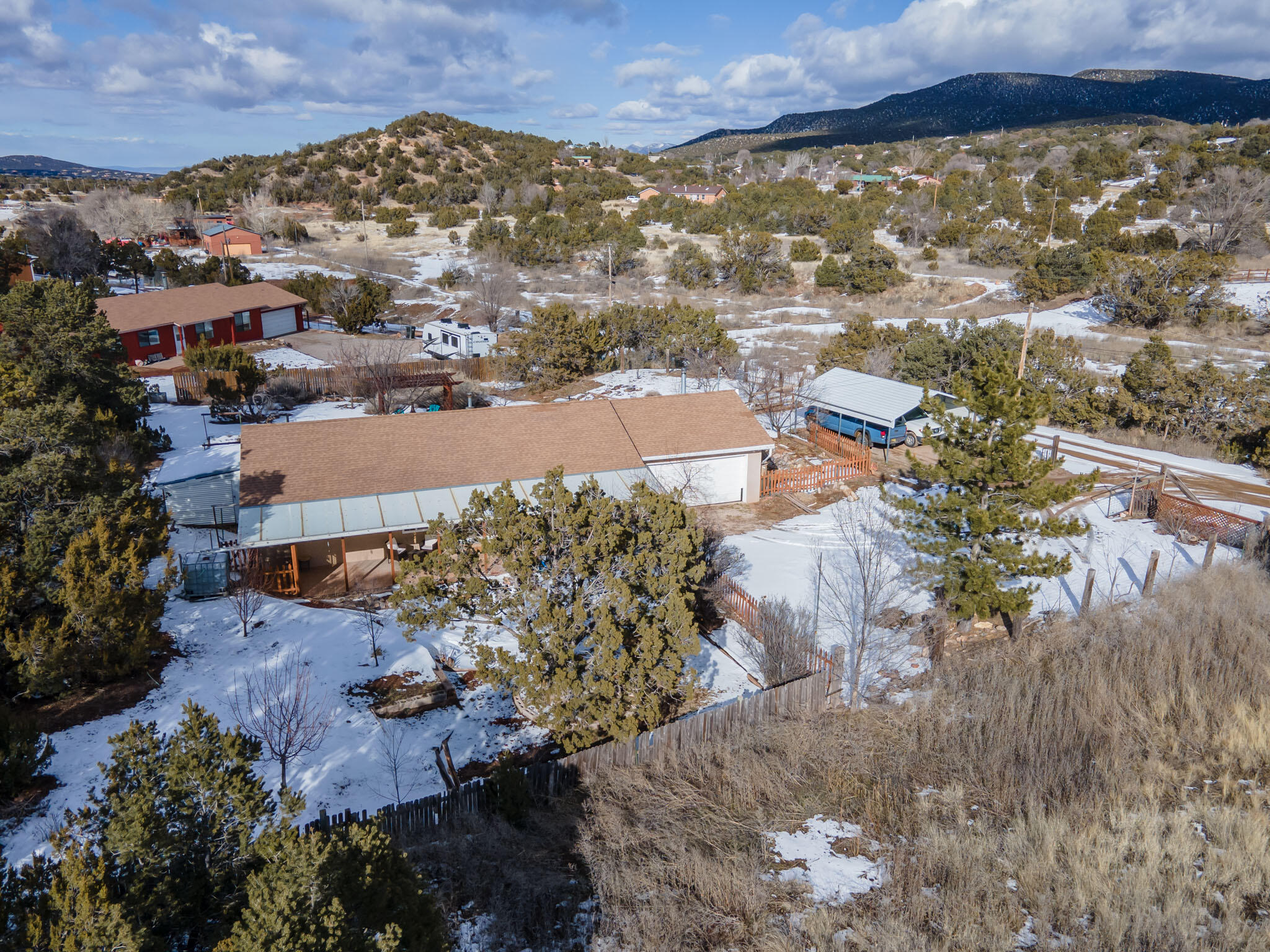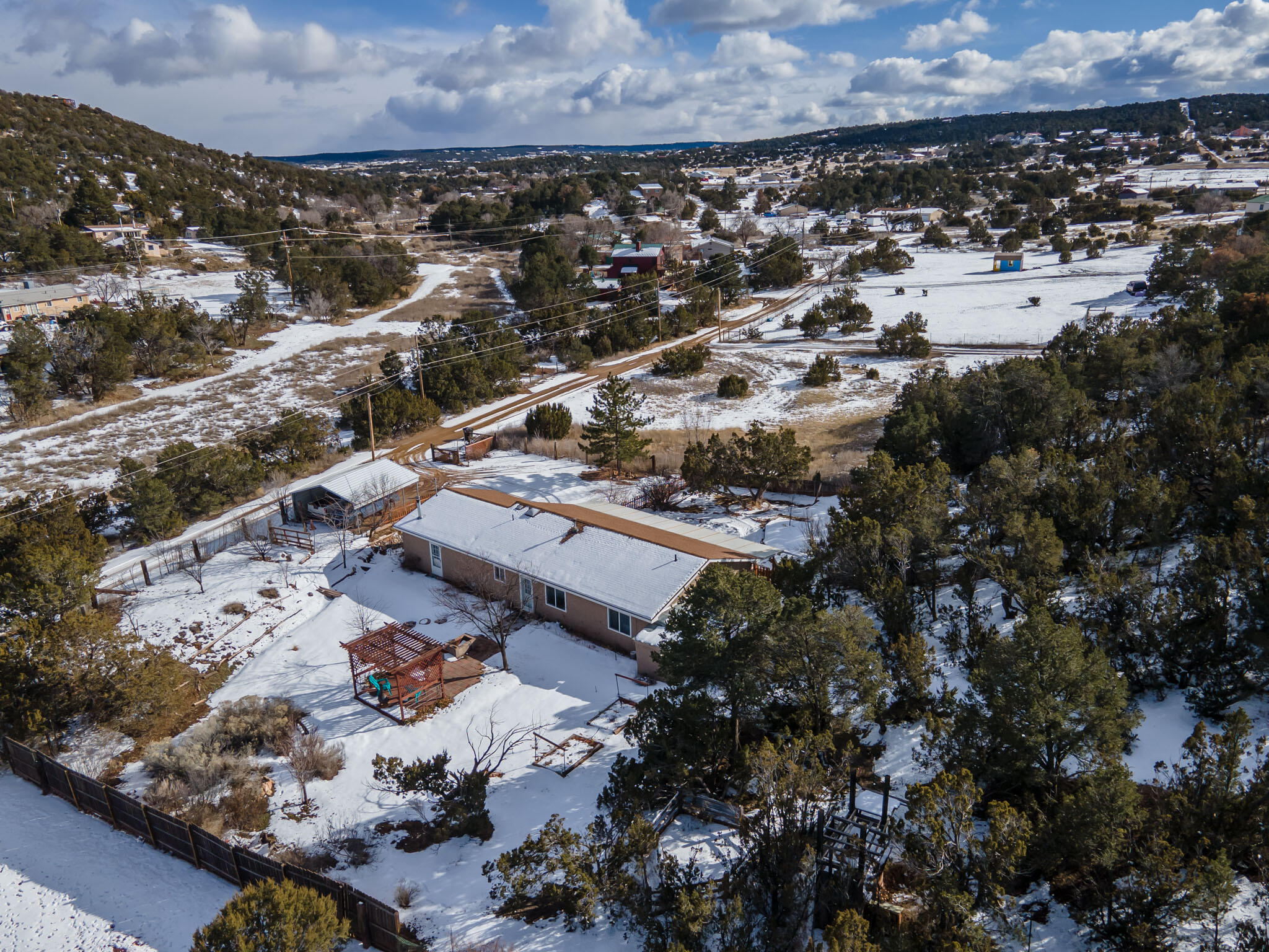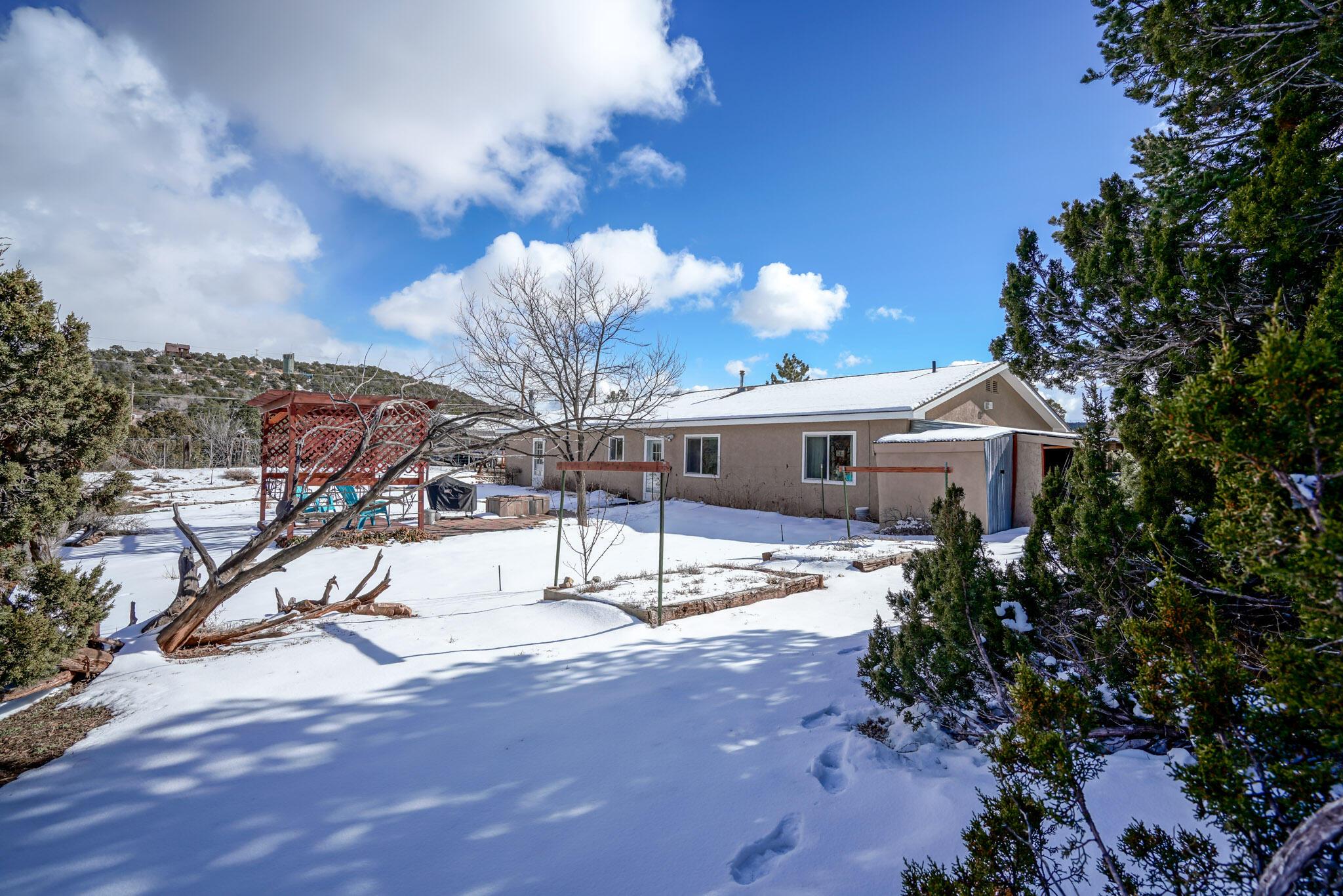 Easy country living in Sandia Park! This well-maintained mountain home is on .75 fenced acre. Cozy pellet stove in main living area, with french doors to let the light pour into the vaulted-ceiling living room. Nicely updated kitchen with hickory cabinets and SS appliances. Nice floor plan with primary bed separate from the secondary beds/bath. Covered porch out front overlooks the fish pond, while block pavers lead to the pergola out back. Enjoy the crisp mountain air while stargazing! Built-in outdoor fire pit, storage/wood sheds, chicken coop and separate carport. Two-car garage has exterior access door and doggie door ready for your pup. All-electric home is on community water system - no well to maintain!