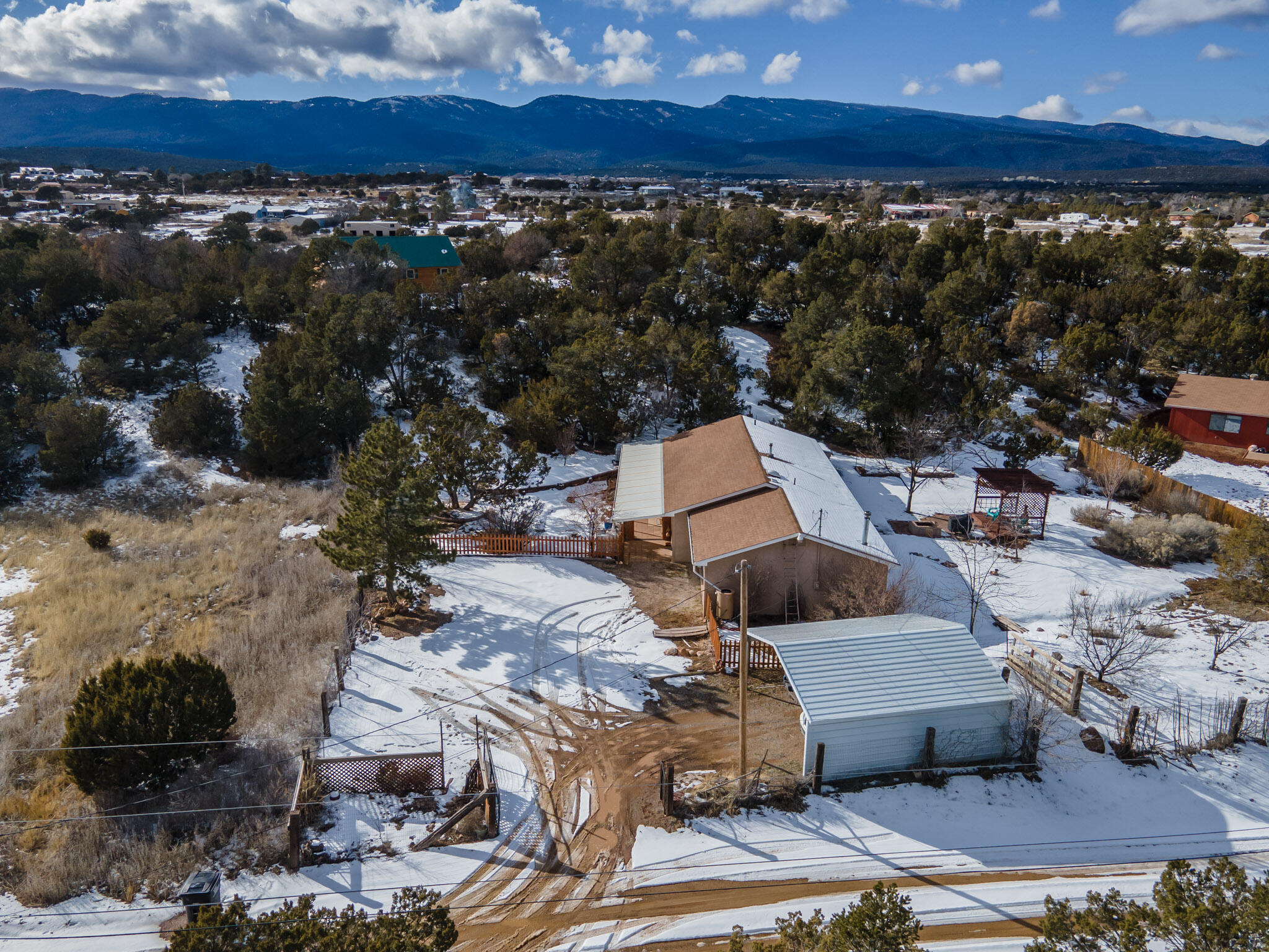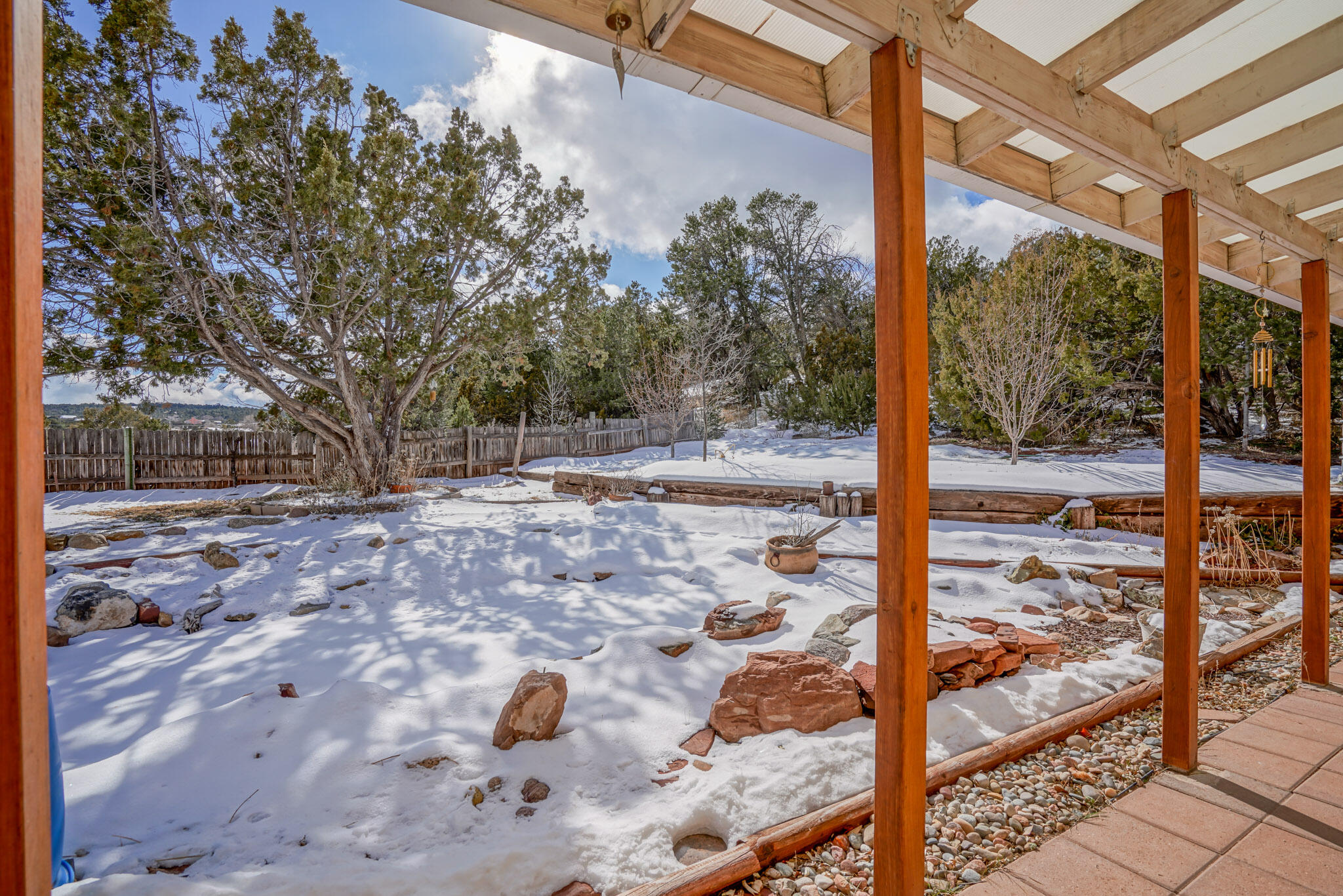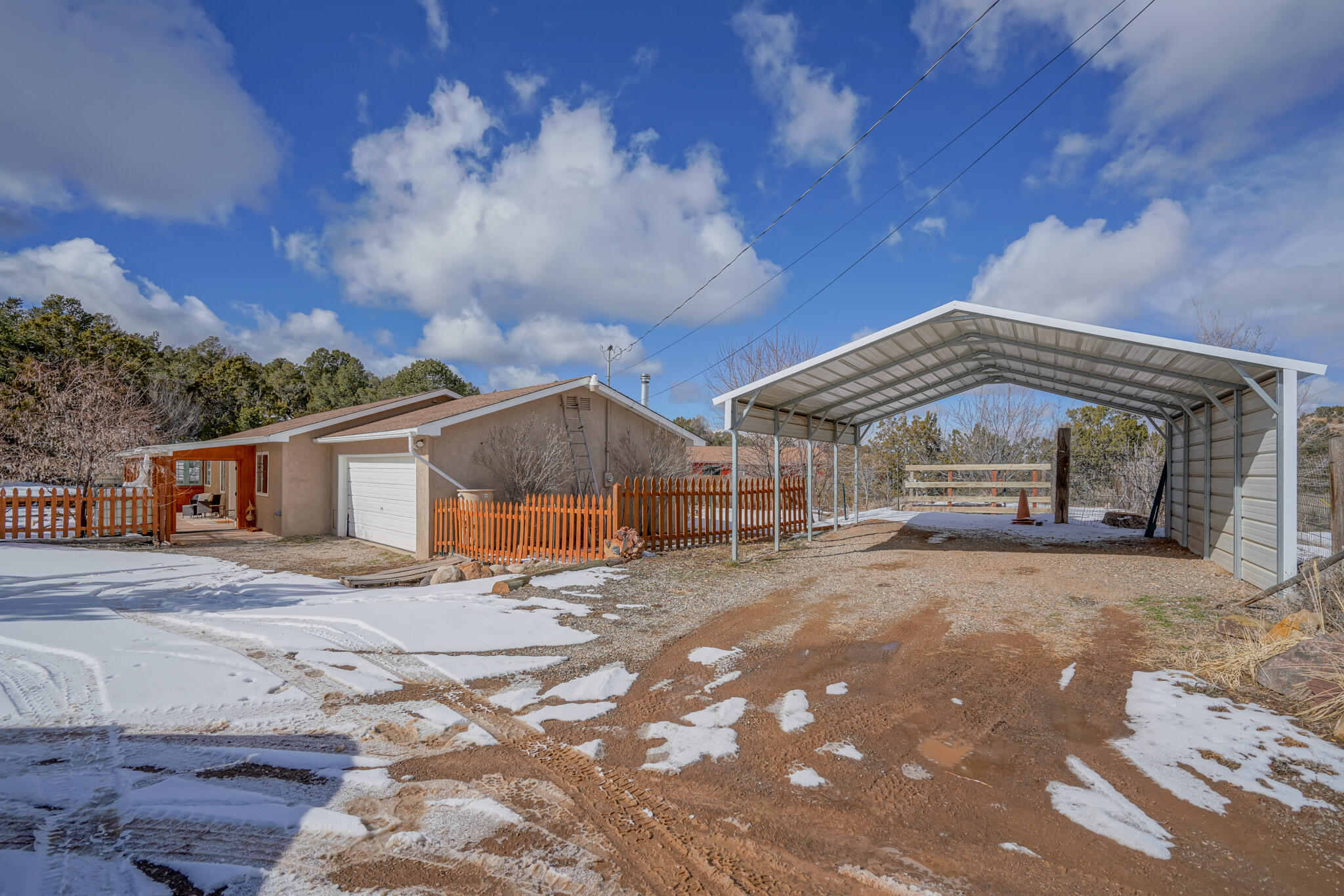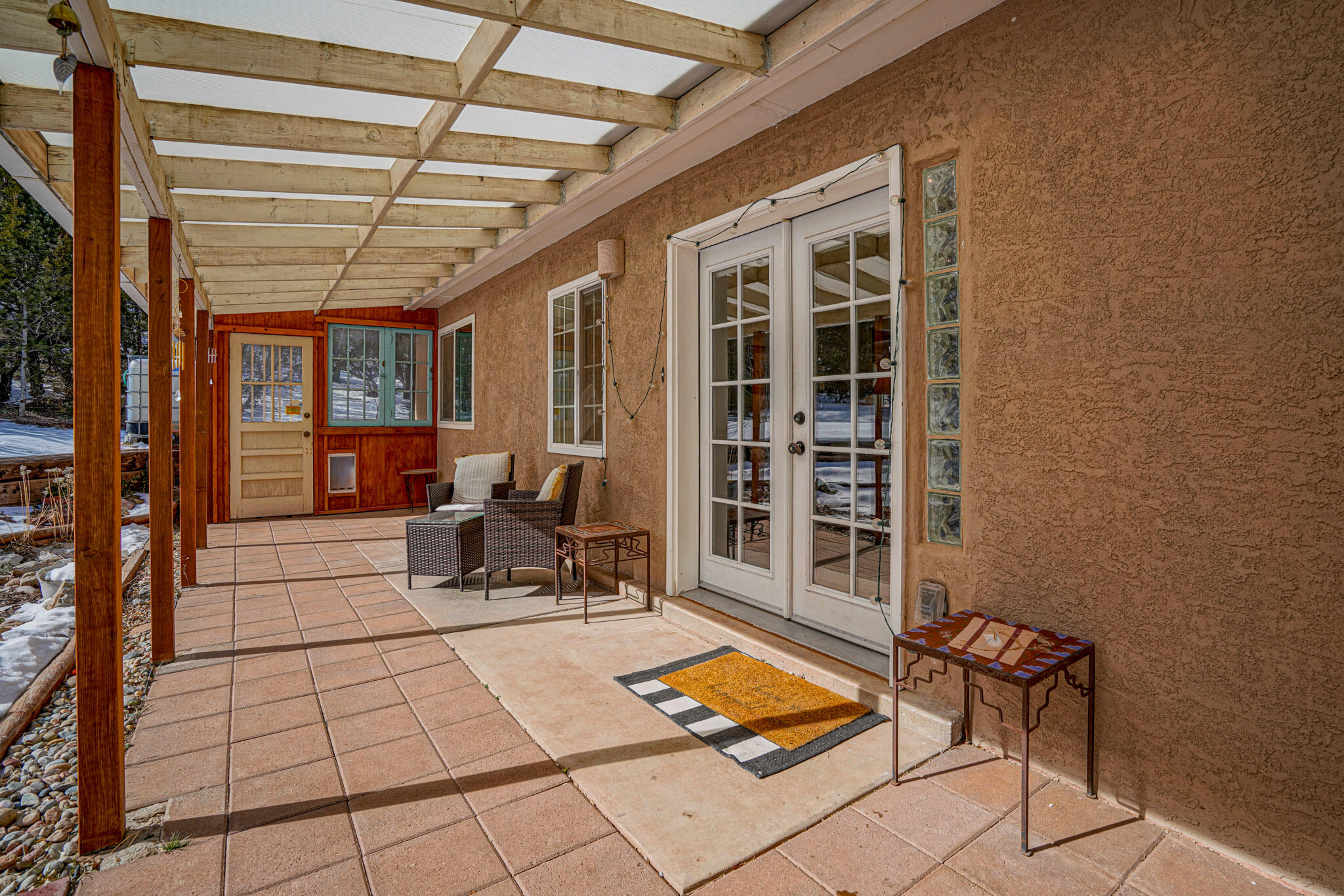 Easy country living in Sandia Park! This well-maintained mountain home is on .75 fenced acre. Cozy pellet stove in main living area, with french doors to let the light pour into the vaulted-ceiling living room. Nicely updated kitchen with hickory cabinets and SS appliances. Nice floor plan with primary bed separate from the secondary beds/bath. Covered porch out front overlooks the fish pond, while block pavers lead to the pergola out back. Enjoy the crisp mountain air while stargazing! Built-in outdoor fire pit, storage/wood sheds, chicken coop and separate carport. Two-car garage has exterior access door and doggie door ready for your pup. All-electric home is on community water system - no well to maintain!