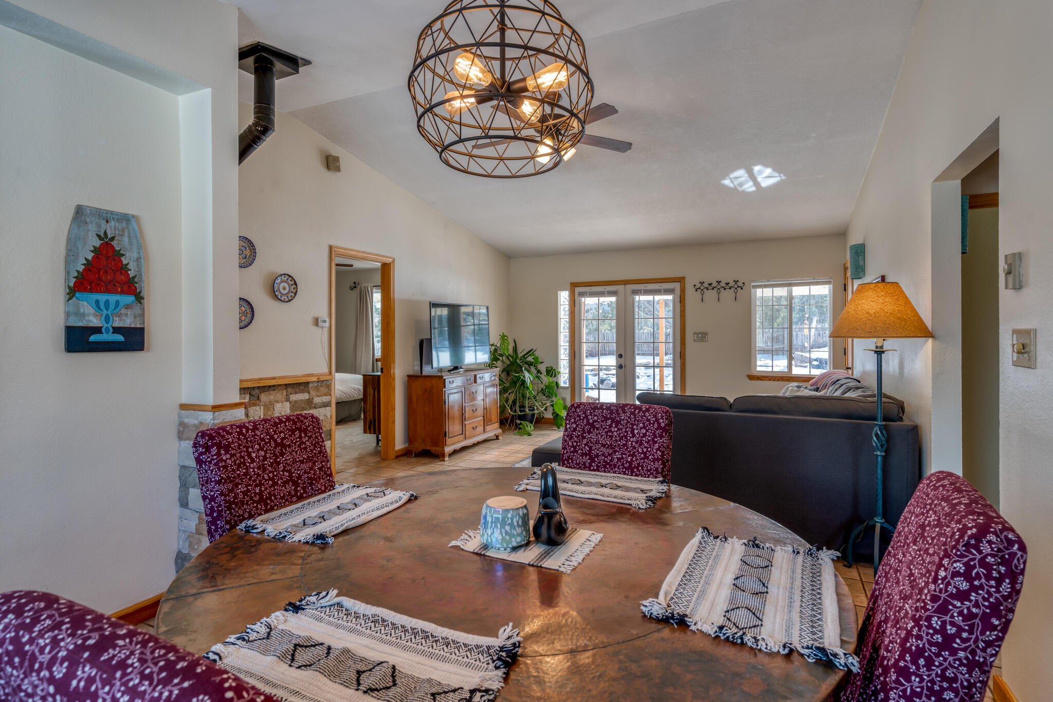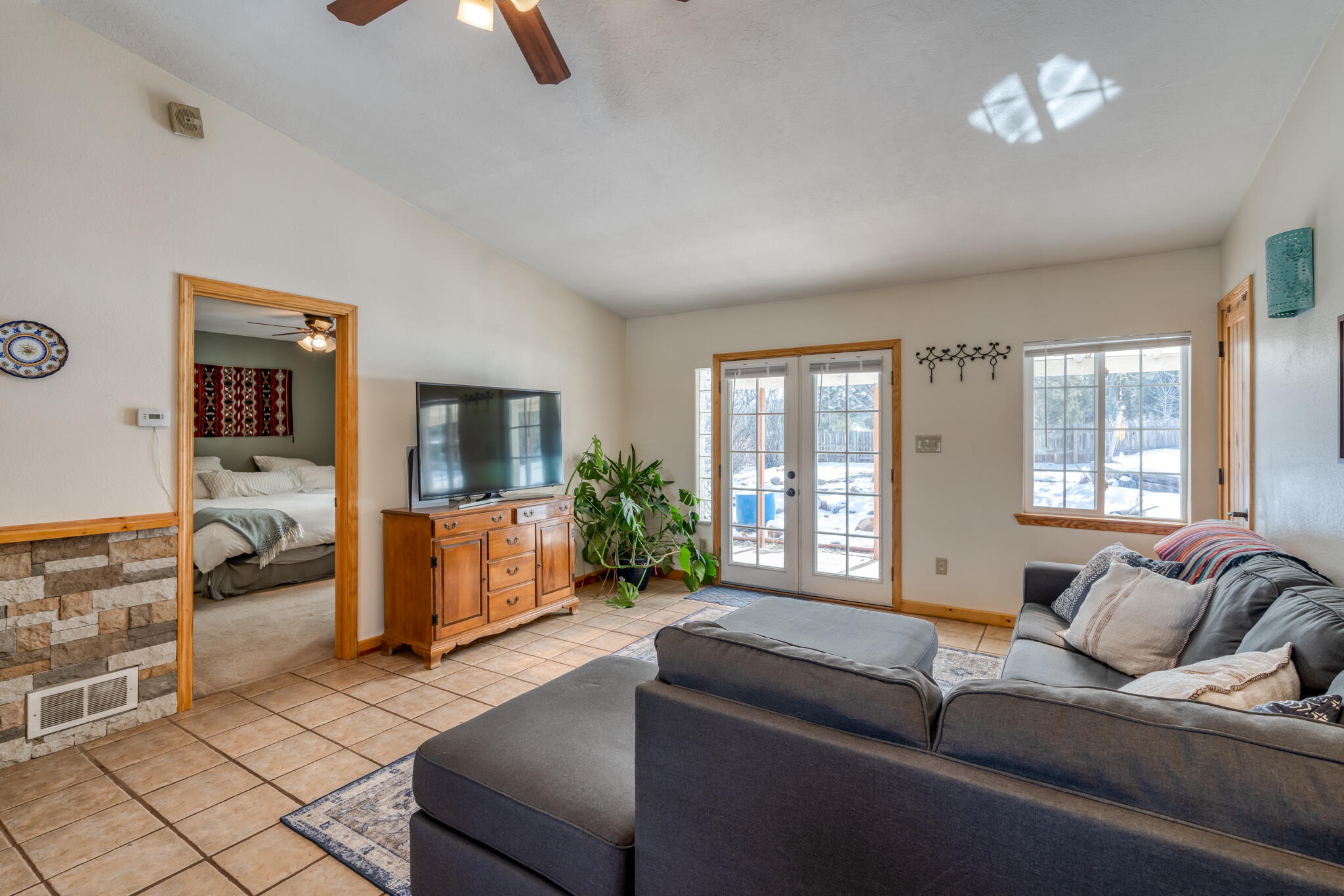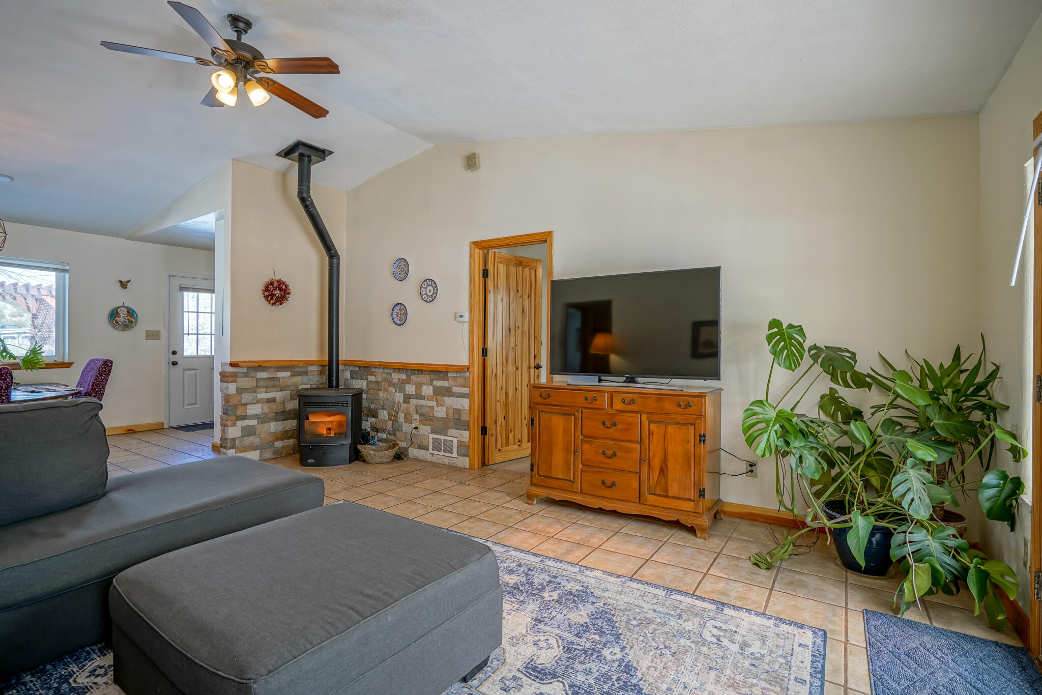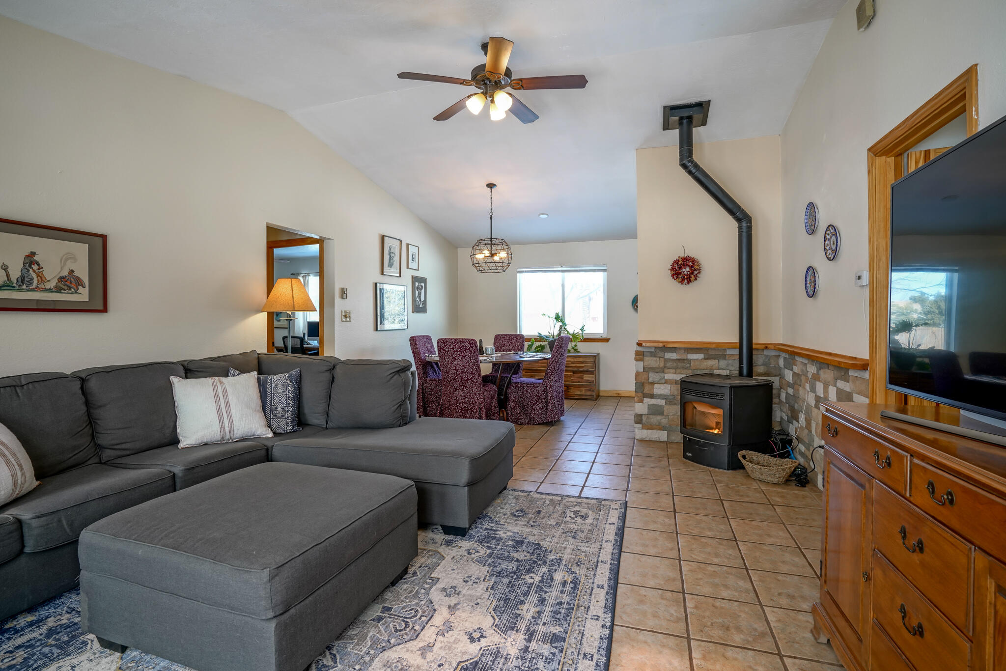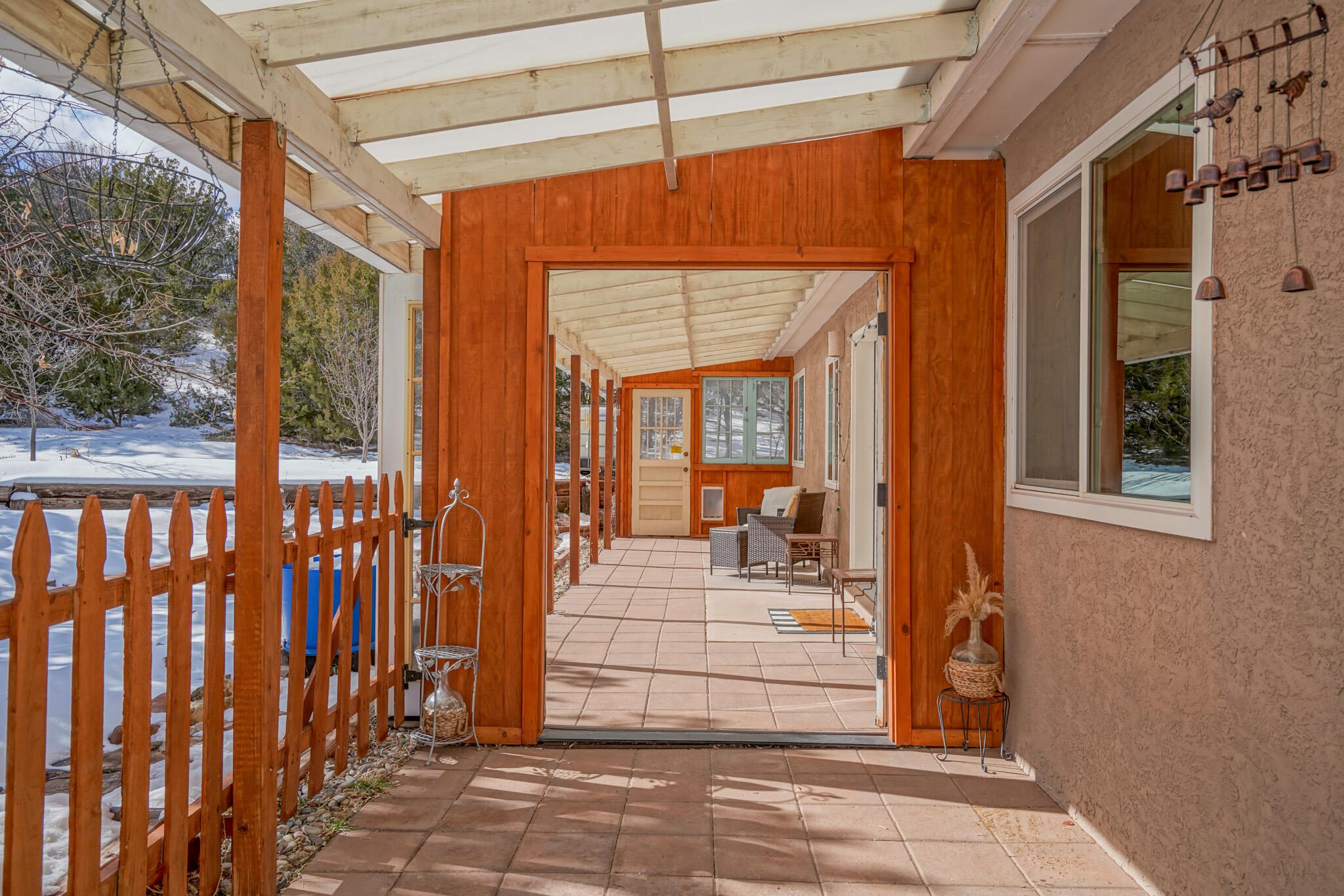 Easy country living in Sandia Park! This well-maintained mountain home is on .75 fenced acre. Cozy pellet stove in main living area, with french doors to let the light pour into the vaulted-ceiling living room. Nicely updated kitchen with hickory cabinets and SS appliances. Nice floor plan with primary bed separate from the secondary beds/bath. Covered porch out front overlooks the fish pond, while block pavers lead to the pergola out back. Enjoy the crisp mountain air while stargazing! Built-in outdoor fire pit, storage/wood sheds, chicken coop and separate carport. Two-car garage has exterior access door and doggie door ready for your pup. All-electric home is on community water system - no well to maintain!