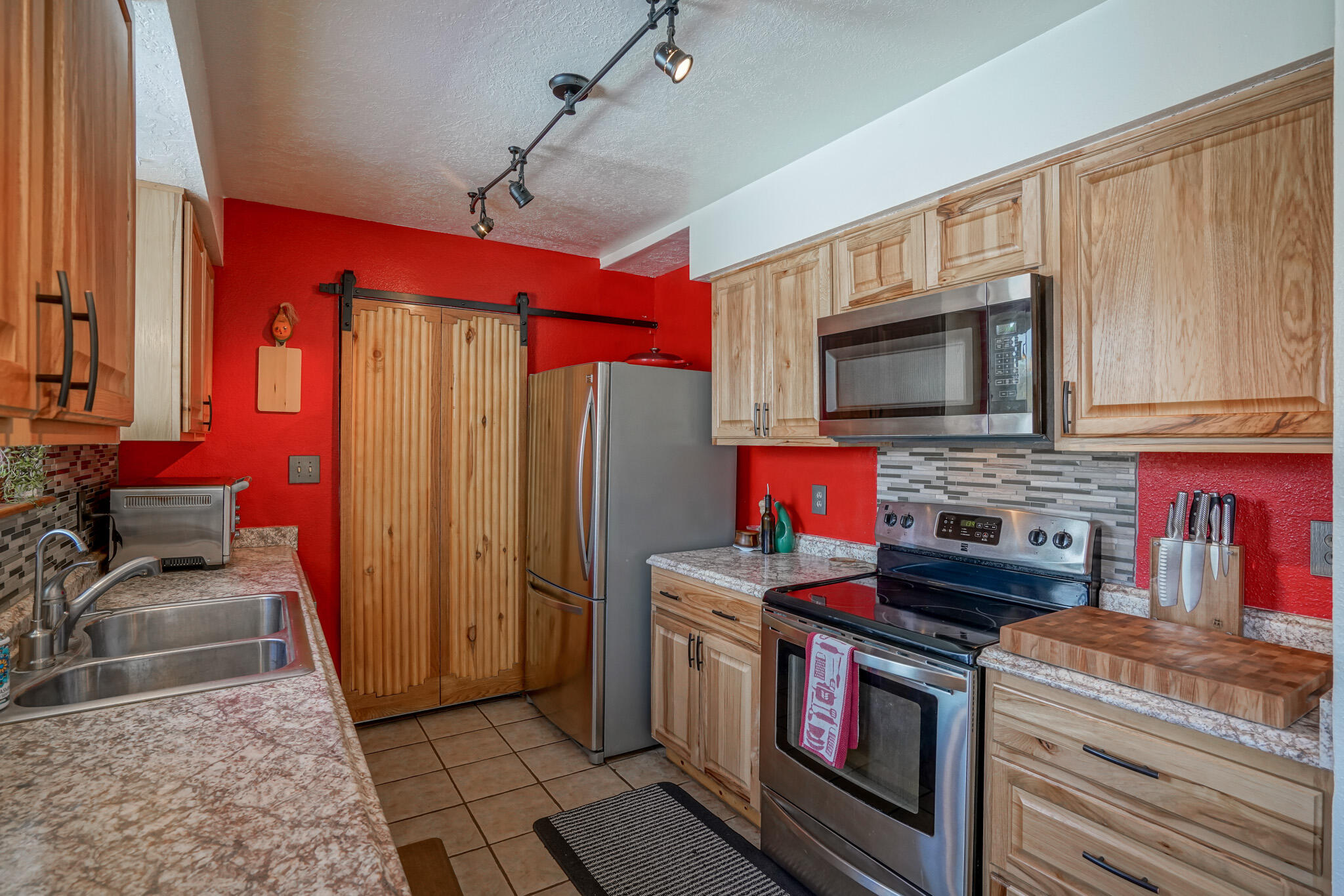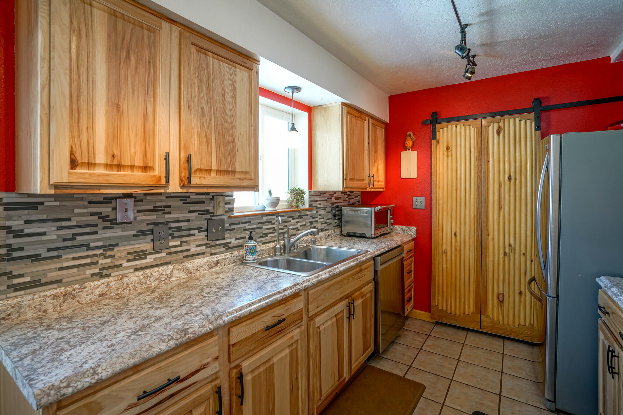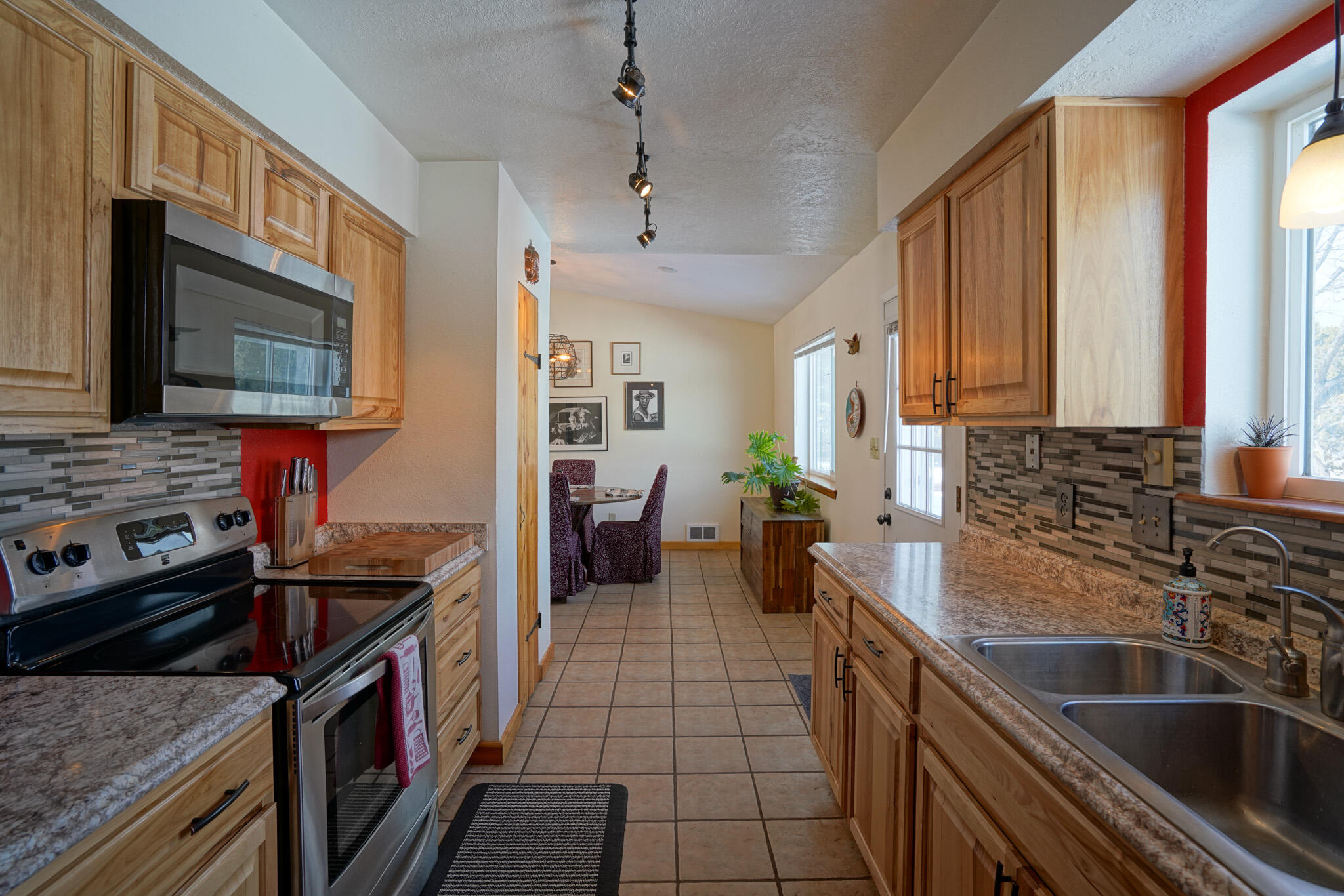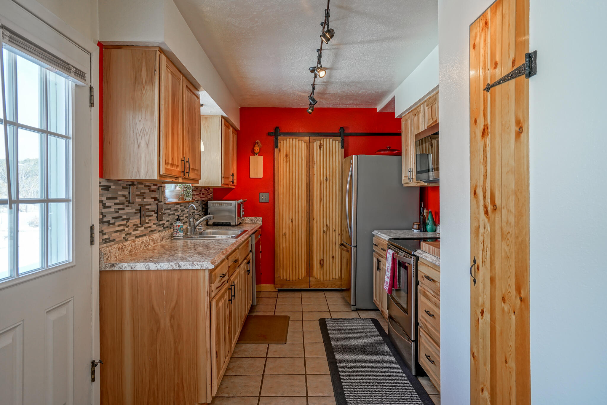 Easy country living in Sandia Park! This well-maintained mountain home is on .75 fenced acre. Cozy pellet stove in main living area, with french doors to let the light pour into the vaulted-ceiling living room. Nicely updated kitchen with hickory cabinets and SS appliances. Nice floor plan with primary bed separate from the secondary beds/bath. Covered porch out front overlooks the fish pond, while block pavers lead to the pergola out back. Enjoy the crisp mountain air while stargazing! Built-in outdoor fire pit, storage/wood sheds, chicken coop and separate carport. Two-car garage has exterior access door and doggie door ready for your pup. All-electric home is on community water system - no well to maintain!