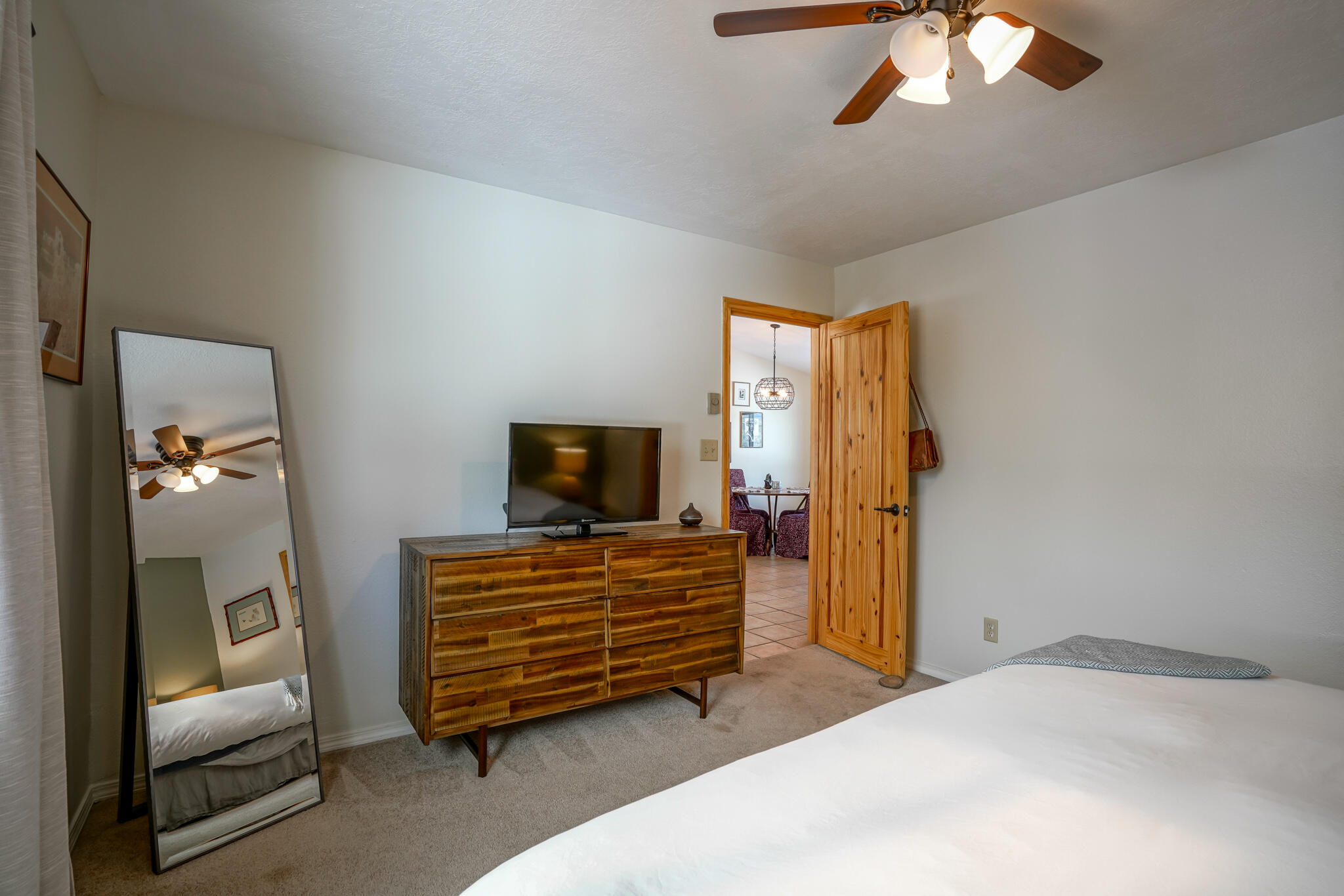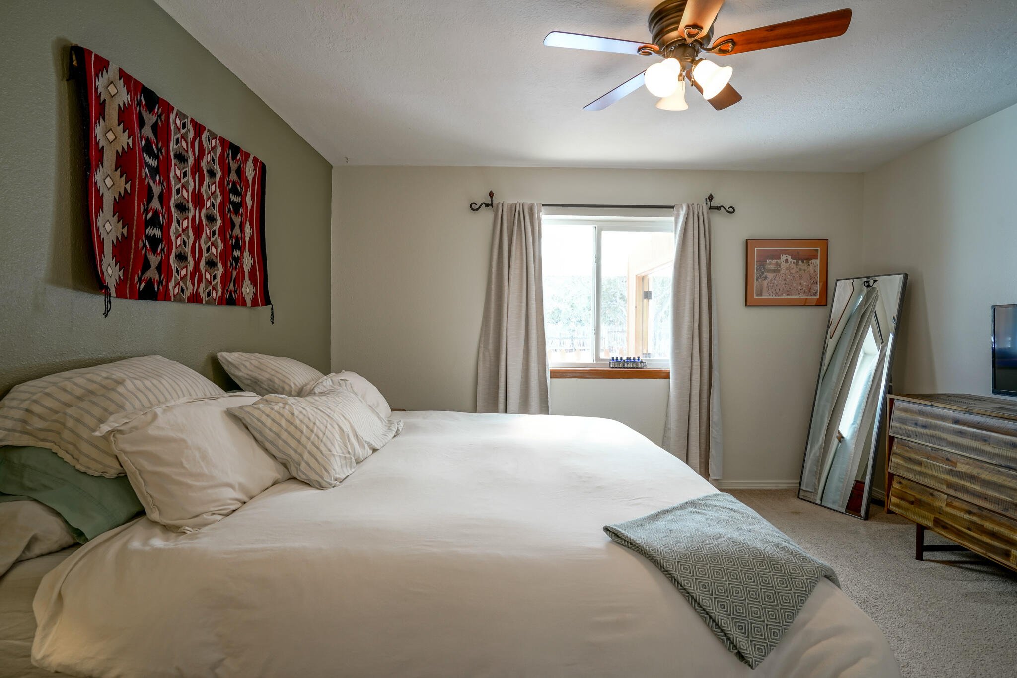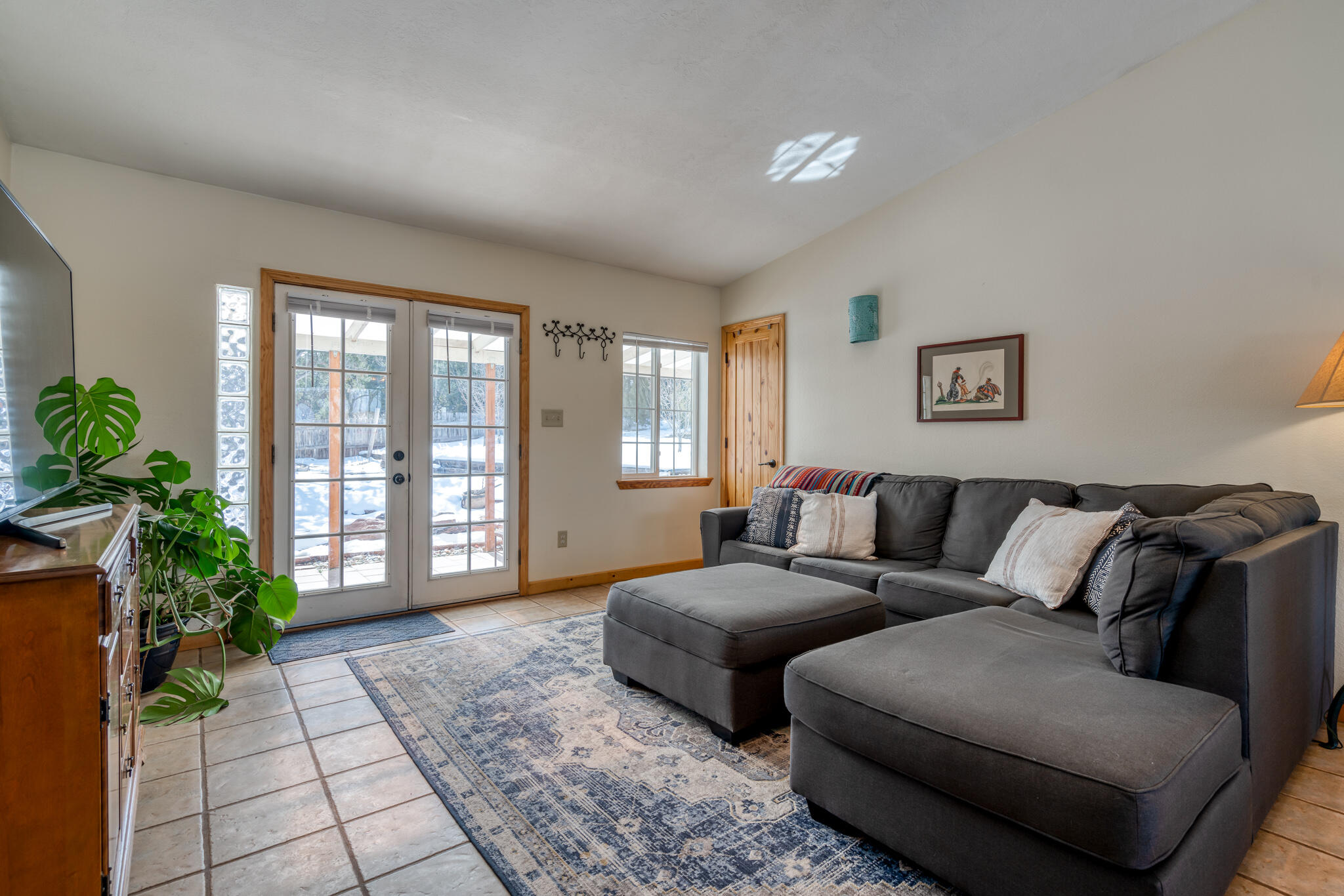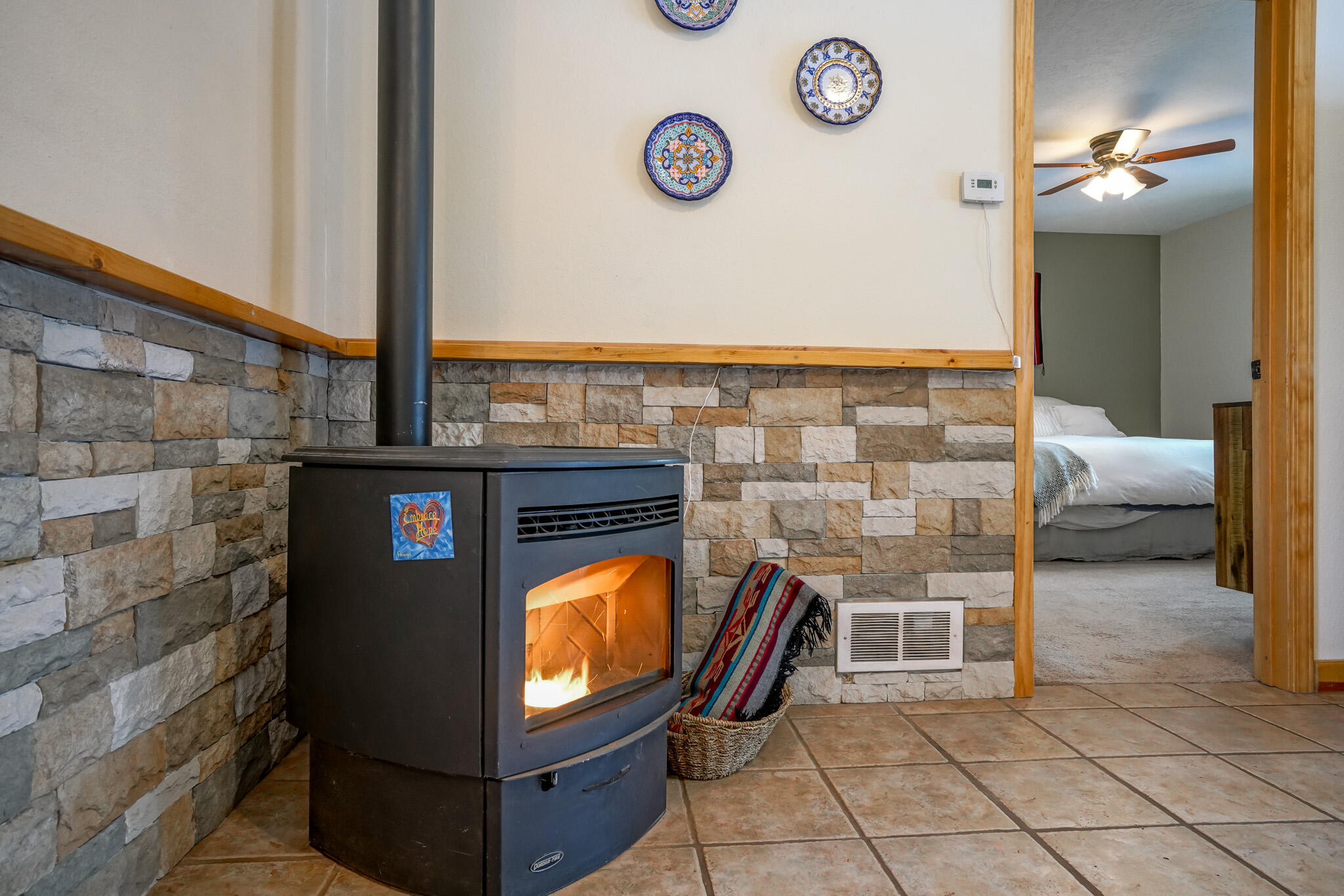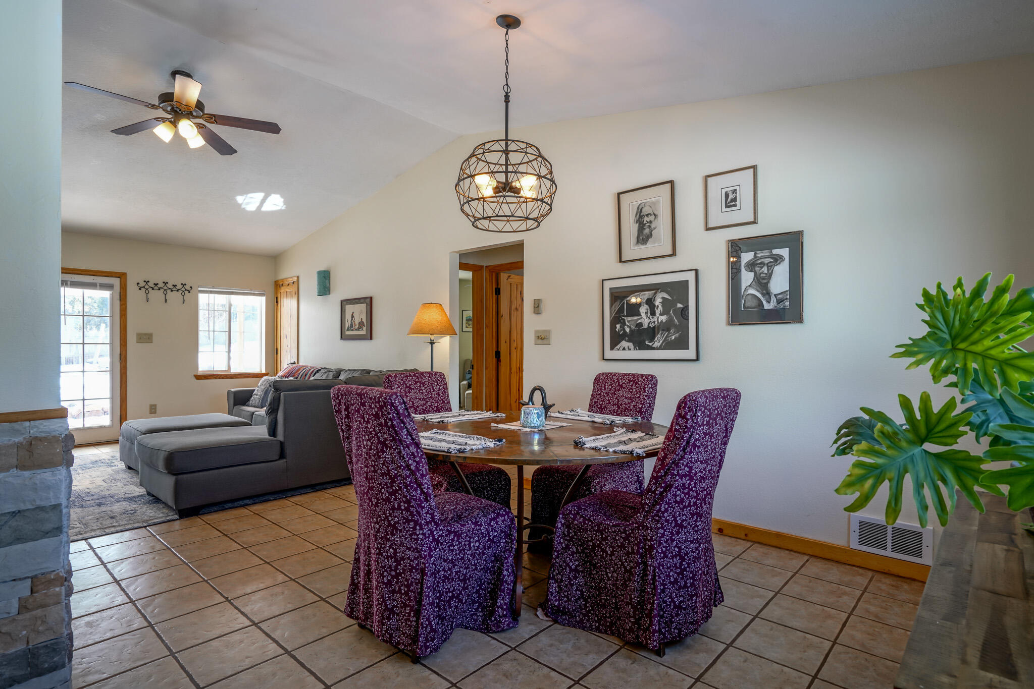 Easy country living in Sandia Park! This well-maintained mountain home is on .75 fenced acre. Cozy pellet stove in main living area, with french doors to let the light pour into the vaulted-ceiling living room. Nicely updated kitchen with hickory cabinets and SS appliances. Nice floor plan with primary bed separate from the secondary beds/bath. Covered porch out front overlooks the fish pond, while block pavers lead to the pergola out back. Enjoy the crisp mountain air while stargazing! Built-in outdoor fire pit, storage/wood sheds, chicken coop and separate carport. Two-car garage has exterior access door and doggie door ready for your pup. All-electric home is on community water system - no well to maintain!