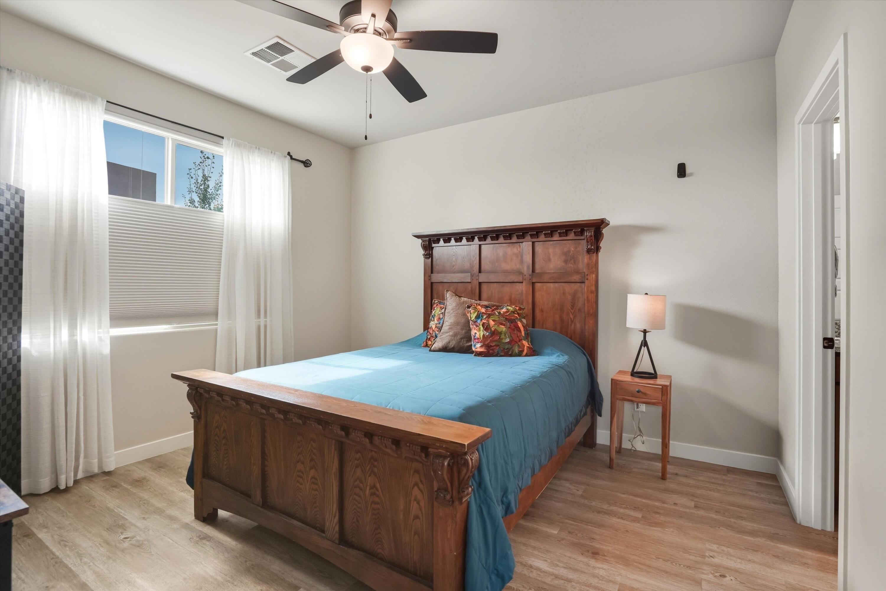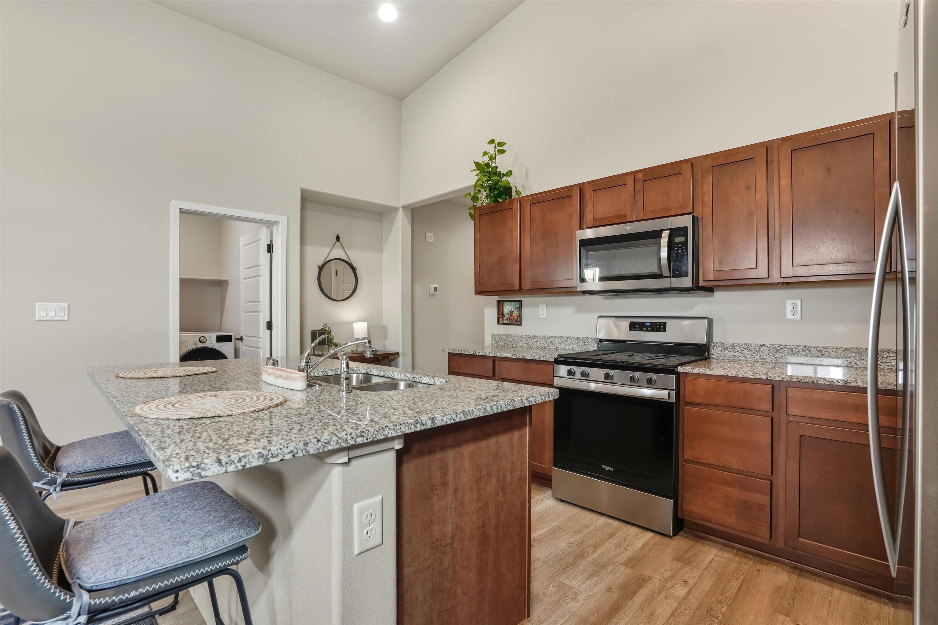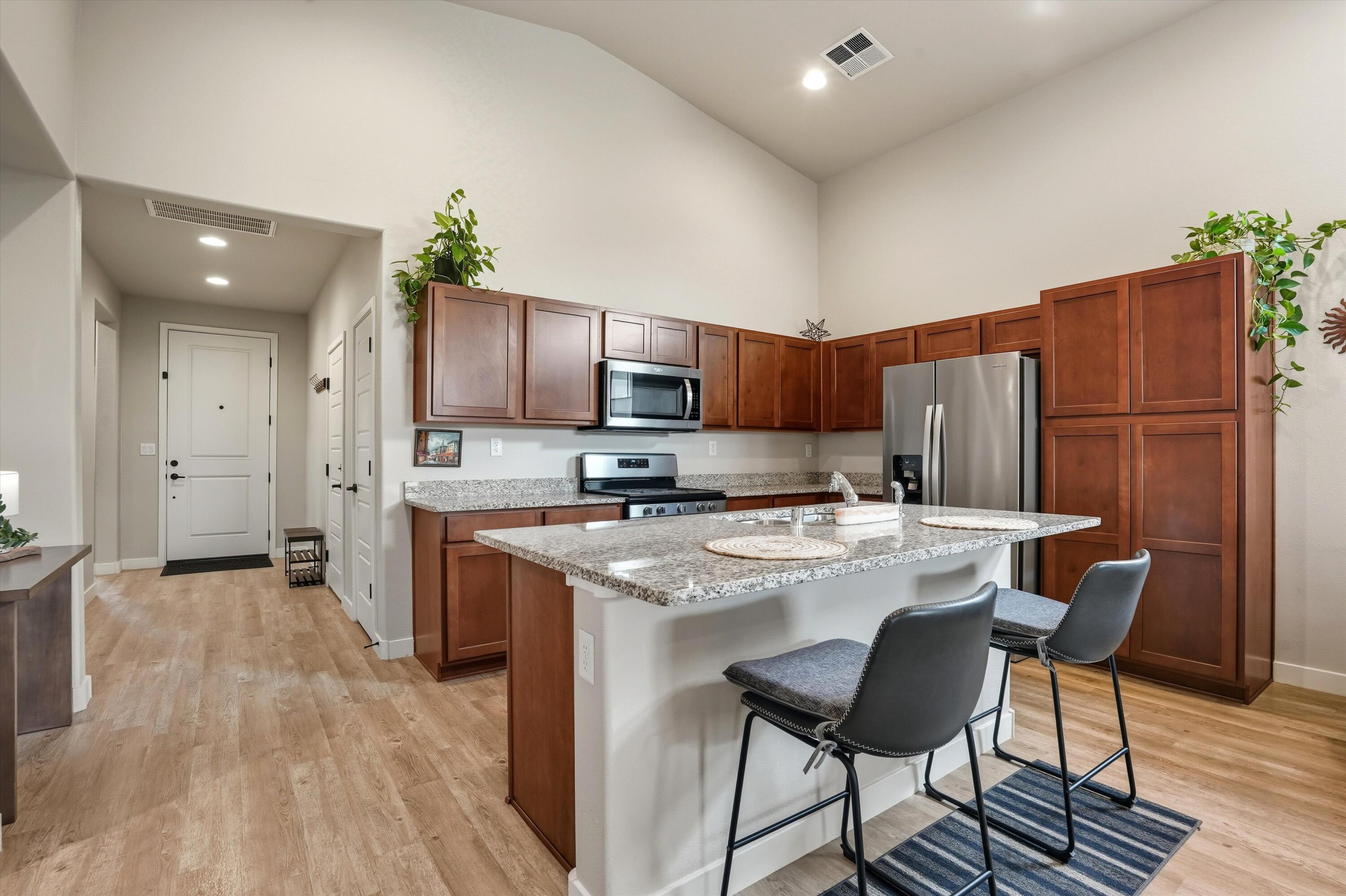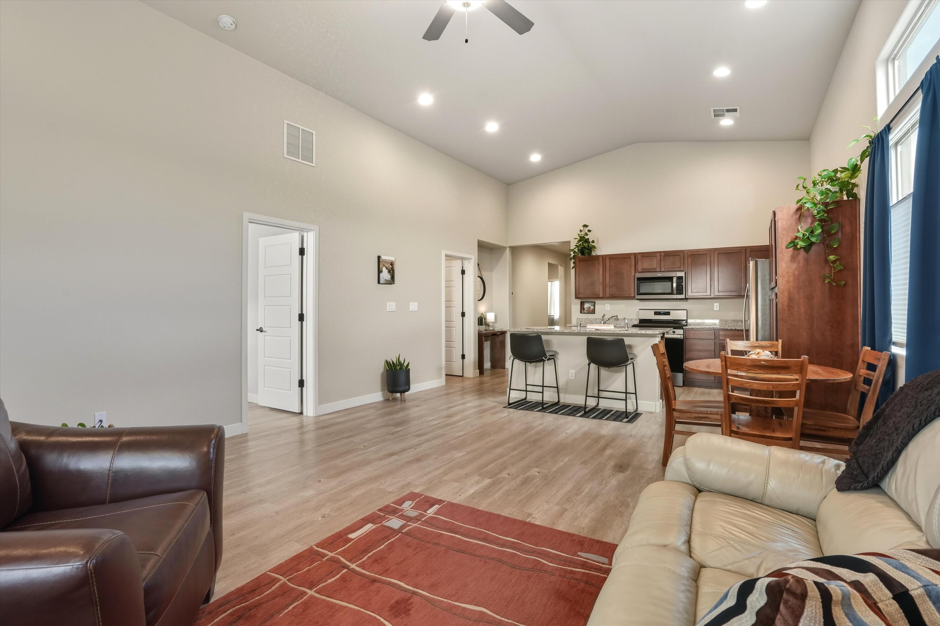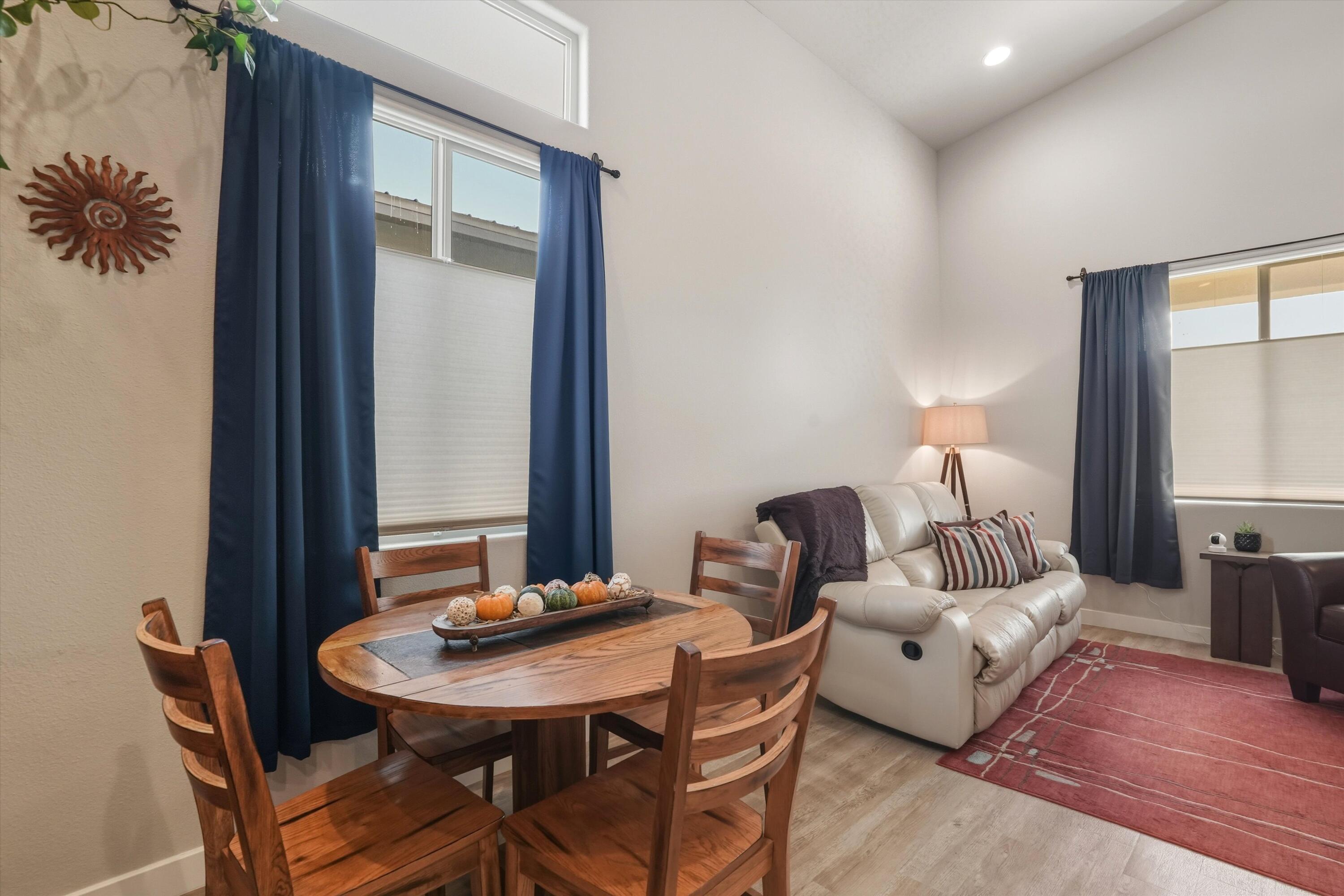 Tucked along the scenic western edge of Tierra Contenta, this move-in ready home captures the perfect balance of comfort, convenience, and Santa Fe charm. Built in 2021 and beautifully maintained by a single owner, it offers an open concept layout with high ceilings, luxury vinyl flooring, and modern finishes throughout. The kitchen features sleek maple cabinetry, granite countertops, and stainless steel appliances Take in a peaceful sunset and mountain views from the covered patio in the backyard. With direct access to walking trails, nearby parks, and easy commuting via 599, you'll love the lifestyle this location offers, whether you're heading to Santa Fe, Los Alamos, or Albuquerque.